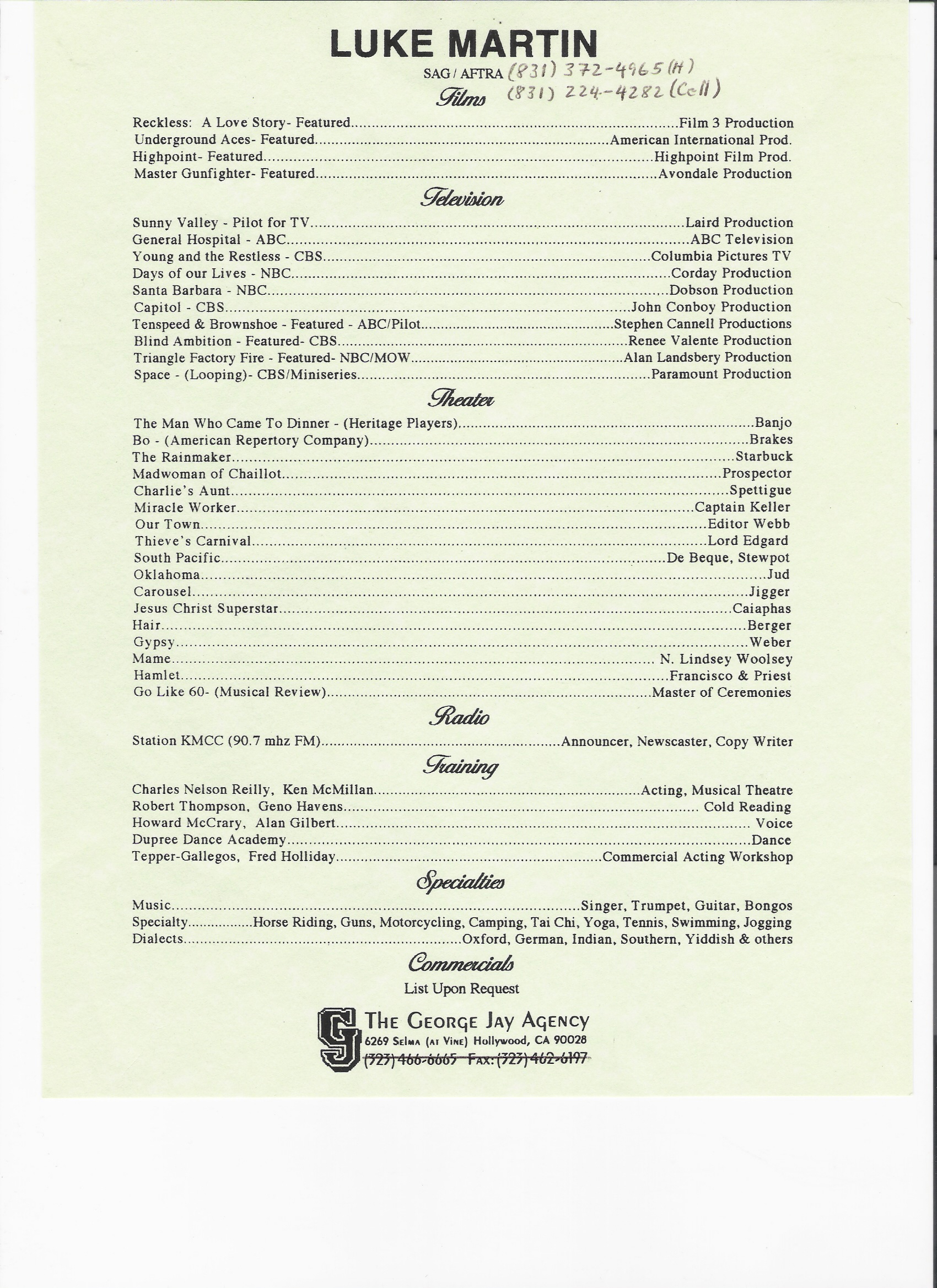 In the early 80’s Luke was an Acting Instructor for The Faculty Acting Academy at  Debbie Reynolds’ North Hollywood Studios.